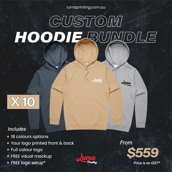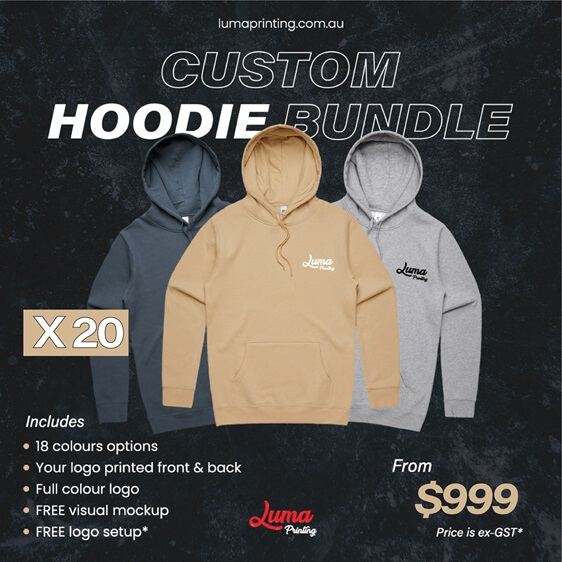 Custom hoodies with full-colour front and back printing or embroidery, long-lasting high-quality finishes, free mockups and logo setup. Mix sizes, choose from multiple colours, get design support if needed, and enjoy reliable Australia-wide shipping with outstanding service.