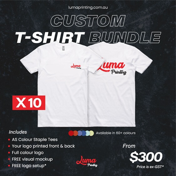 Bundle price starts at $300 (ex GST) with full-colour front and back printing. Durable, high-quality prints, free mockups, free logo setup, multiple colour and size options, and Australia-wide delivery included. Custom designs and logo support available.